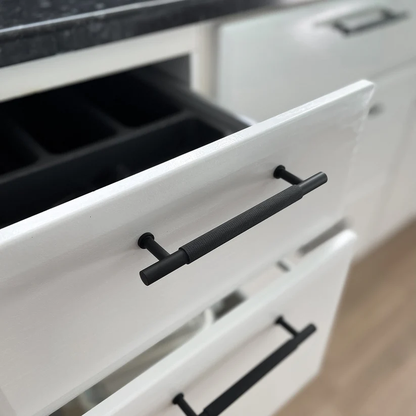 Bøjlegreb i mat sort 128 mm er et moderne og stilrent valg til dig, der ønsker at opgradere skabe, skuffer og kommoder med et eksklusivt udtryk. Grebet har en riflet midterdel, som ikke blot tilfører karakter til designet, men også giver et behageligt og sikkert greb i daglig brug. Det gør grebet velegnet til både køkken, badeværelse, garderobe og øvrige møbler i en moderne indretning.