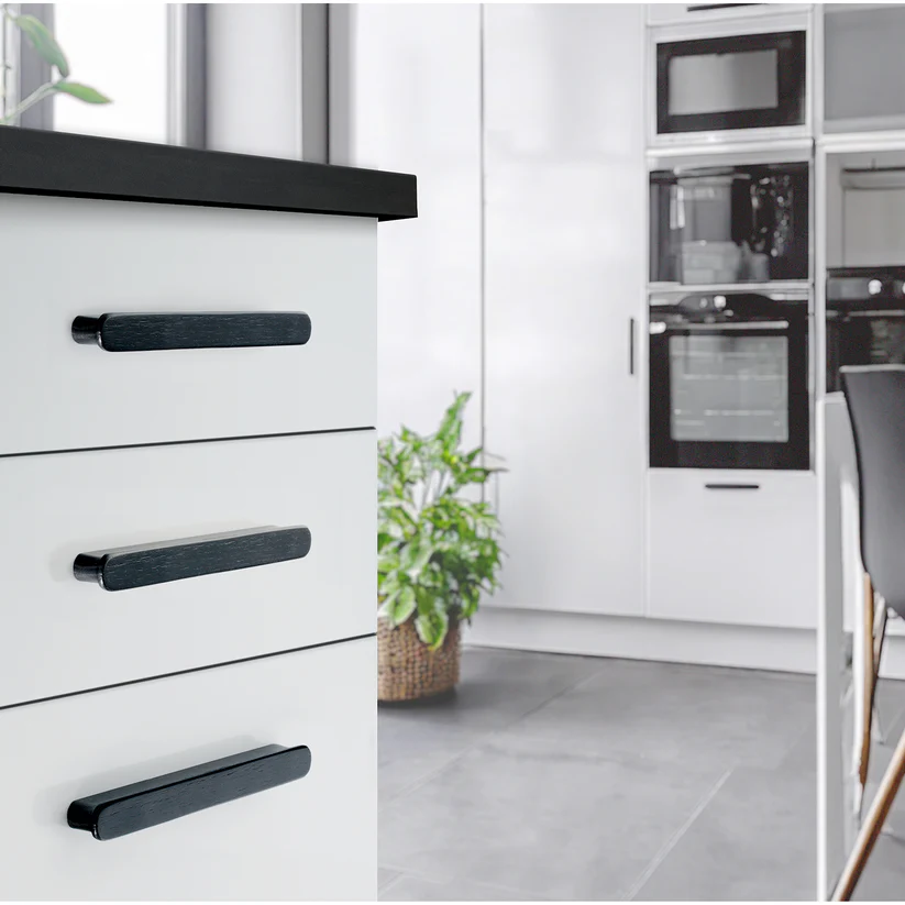 Møbelgreb i sortbejdset asketræ 96 mm er et stilrent valg til dig, der ønsker at skabe kontrast og tilføre dine skabe, skuffer og kommoder et eksklusivt og moderne udtryk. Den mørke overflade kombineret med træets naturlige struktur giver et levende og elegant look, som passer perfekt ind i både moderne og nordiske indretninger.