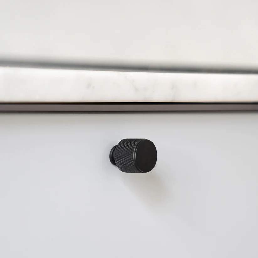Denne runde møbelknop med riflet greb i mat sort er designet med fokus på både æstetik og funktionalitet. Den riflede midterdel giver et sikkert og behageligt greb, hvilket gør den ideel til daglig brug i køkken, badeværelse, garderobe eller på kommoder.