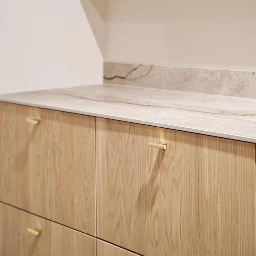 Denne store møbelknop i børstet messingfinish med riflet overflade er ideel til større låger, garderobeskabe og kommoder, hvor designet gerne må træde frem og skabe en visuel effekt. Kombinationen af størrelse og struktur gør knoppen til en både funktionel og dekorativ løsning.